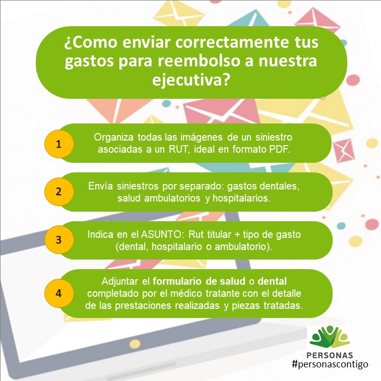 Recuerda que los reembolsos de salud hospitalarios, ambulatorios o dentales deben ser enviados por correo a nuestra ejecutiva con copia a beneficios, haz click aquí para ver una infografía en donde te explicamos paso a paso como realizar esta solicitud.